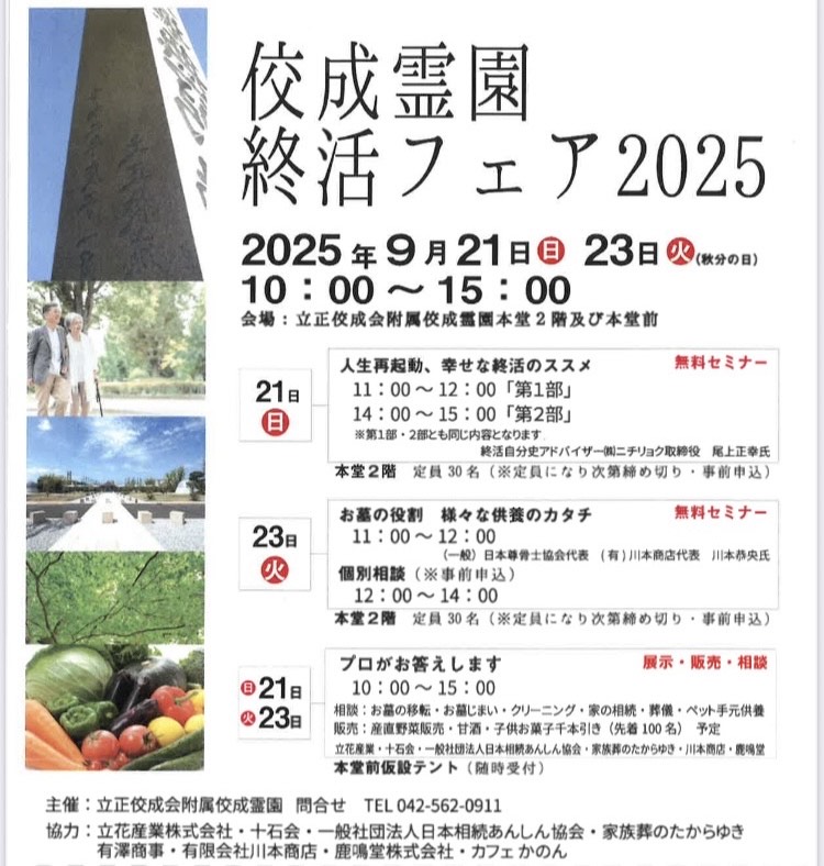 一般社団法人日本相続あんしん協会は、9月21日に引き続き、「佼成霊園終活フェア2025」に参加します。